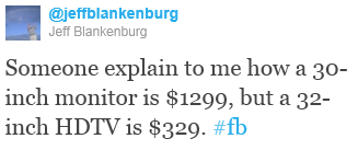 So, I decided to do a little research, and below are my results. I am comparing a 32” Vizio 1080p HDTV with Dell’s top-of-the-line 30” UltraSharp monitor. My question for you, dear reader, is why would I get the monitor over the television?