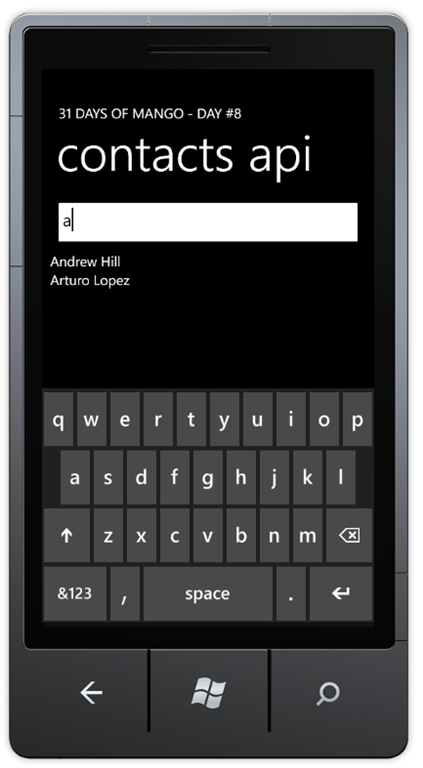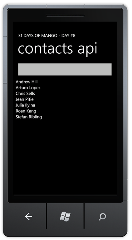 With this new namespace in Windows Phone 7.5, we now have the ability to treat the user’s contact list like a local database. We can search it, grab multiple contacts, and get their entire contact record. It’s much more robust, but working with it is also much more manual.