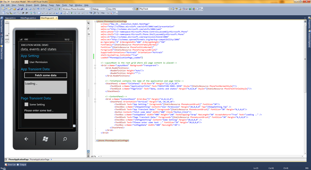 Now, back in our MainPage.xaml’s code-behind, let’s add event handlers for the page’s loading event & the click of the button to fetch some data (which we totally fake), as well as the application setting checkbox’s state being changed. Notice how we hang on to the fetched data at the application level and also how we immediately save application/user settings in the phone’s Isolated Storage: