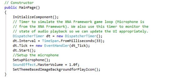 The key point to note here is the game loop we have created using the DispatcherTimer. This loop is essential to capturing the audio from the microphone.