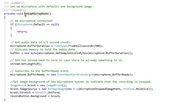 As you will see in the application, we don’t call stop immediately when the user toggles the microphone or clicks the play button. Instead we let the microphone raise the buffer ready event at the selected buffer duration to capture the last bit of audio data before stopping recording.