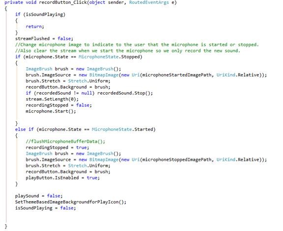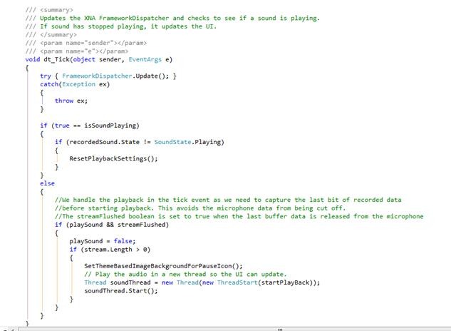 2. Microphone is recording: At a minimum we have to stop recording. If you recall the note from above, we cannot call Microphone.Stop immediately as all recorded data has not been flushed to the MemoryStream. So we use boolean varibles to keep track and defer the stop action to DispatchTimer event.