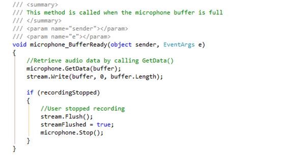 2. public event EventHandler<EventArgs> BufferReady: This is an event provided when the microphone is ready to release the buffered audio. We need to handle this event and store the audio for playback.
