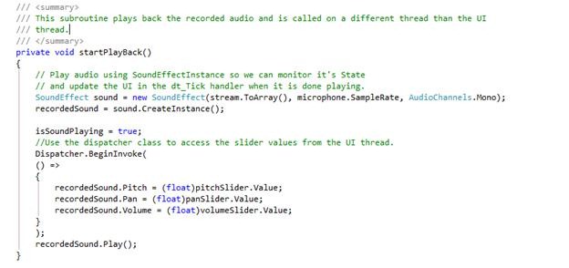 We are triggering audio playback on a different thread to allow the UI to update. This means any code inside our playback routine that chooses to update UI elements has to do it by calling Dispatch.BeginInvoke as shown below.