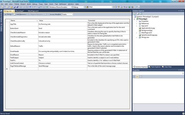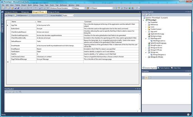 Once you’ve finished with this, follow the same procedure for any additional locales you wish to support being careful that all resource files have an access modifier of Public, keep the same name, and contain the appropriate culture code. It’s also important to note that the resource editor may not display certain foreign character sets correctly when copying and pasting from Bing Translator to the resource editor, but these characters should look fine on the actual device and the emulator.