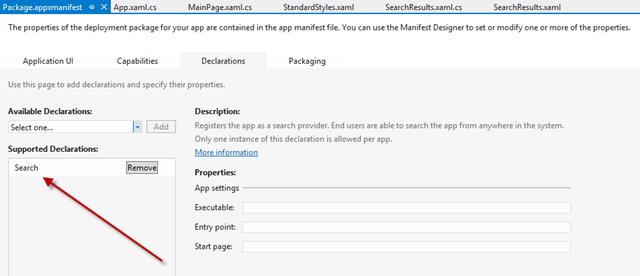 There’s one last thing that I want to cover in this article, and this is more for your knowledge than something that actually needs to be done.  When you added the Search Contract to your project, there were several files added to your project, but there was also a declaration made in your appmanifest file.  If you open that file, and navigate to the Declarations tab, you should see something that looks like this: