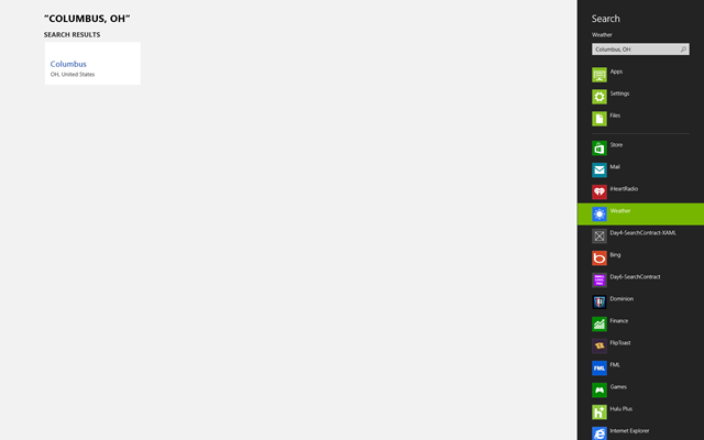 As you can see, it works, but we’re not really providing any value because we don’t have anything to search.  That comes next.  Before we get to that, let’s talk about the philosophy behind search in Windows 8.
