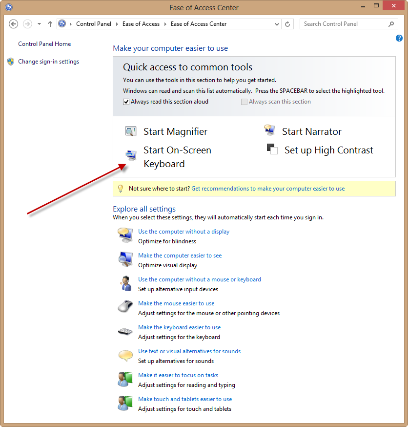 And clicking the “Start On-Screen Keyboard” option. You will discover a keyboard that looks like this, instead: