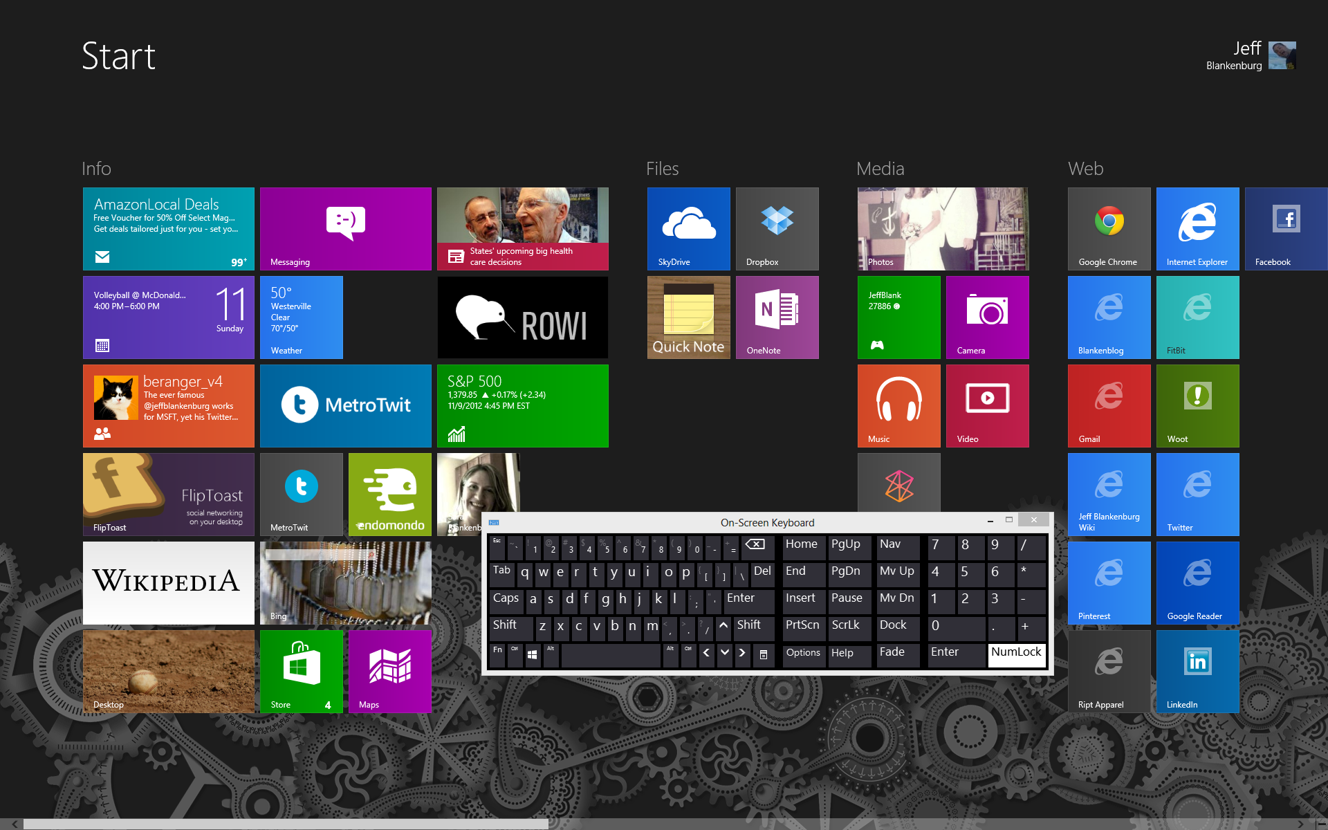 The primary focus of this keyboard is to allow a user to completely use Windows without having a keyboard attached to their computer. It’s not customizable, and doesn’t respond to any of the code we are going to write in this article. This keyboard is also one of the only windows that can be placed over the Start Screen. Check this out: