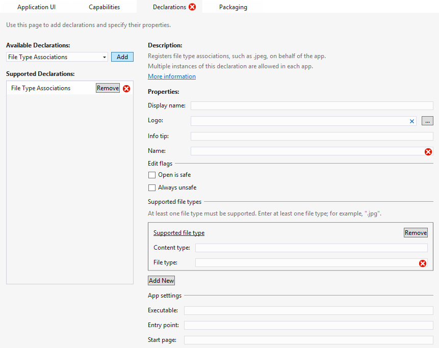 You will see that it fills the screen with a new form for specifying the file associations you would like to register your app with. By default, it has a few red Xs that you will need to address.