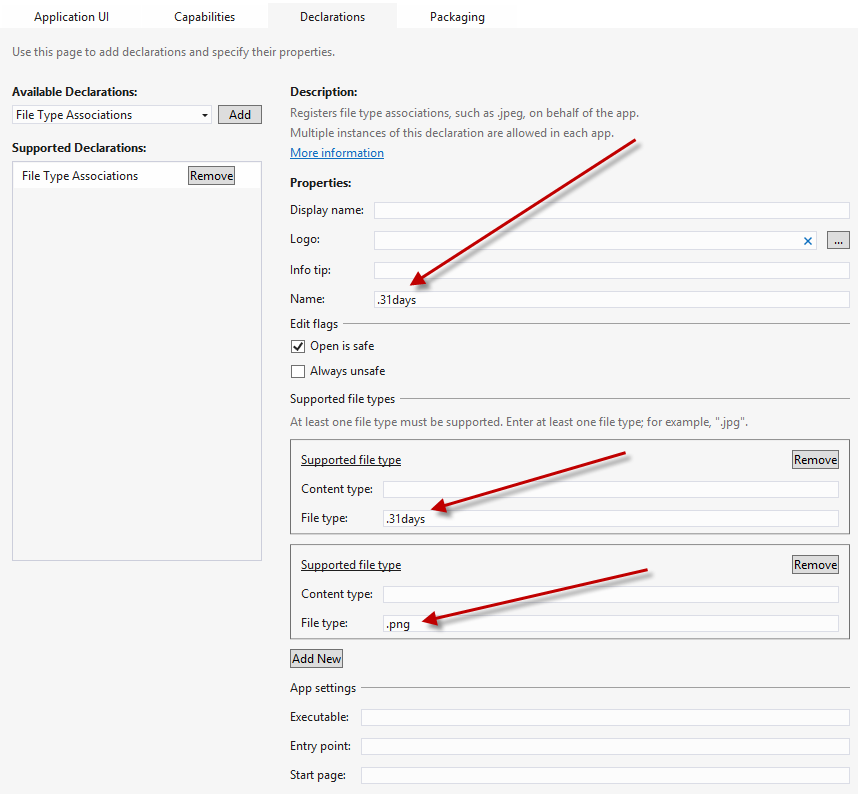 For this sample, I am going to pick two different file types. The first will be a custom extension that files created by my app will use: “31days". The other will be to register with the “png” extension, so we can try to open images with this application as well.