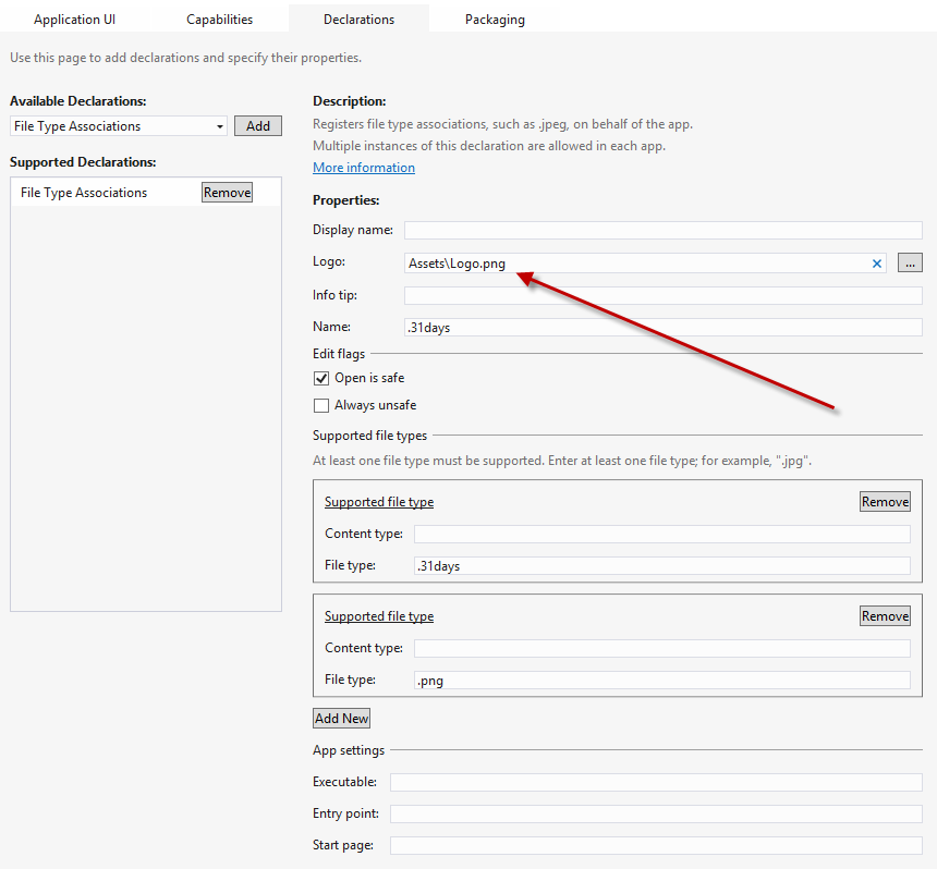 That’s not going to work. We want our logo or icon to appear when we are the default application for a file type. Just as Excel files have an Excel icon, so too should .31days files have a 31 Days icon. To do this, jump back into your package.appxmanifest file, and specify a logo in the section where you specified name, like this: