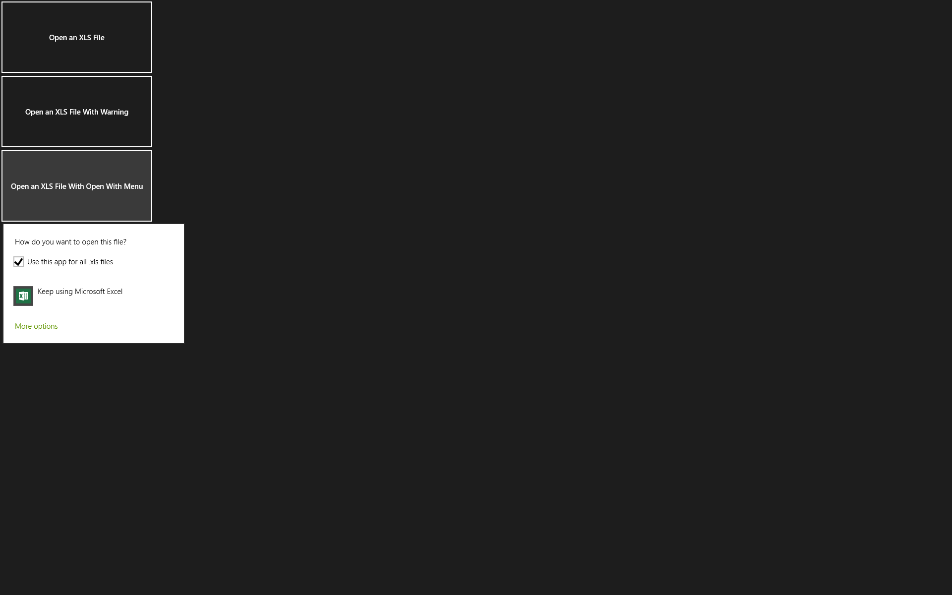 Sometimes, your application just can’t open every single file type. For example, Microsoft Outlook is really good at accepting images, text, and files, but if you’ve ever tried to open an Excel file attached to an email, you’ve probably noticed (and come to expect) that the file gets opened in Excel, not Outlook. We want to provide that same functionality to our users. To do this, we are going to explore the Windows.System.Launcher class.