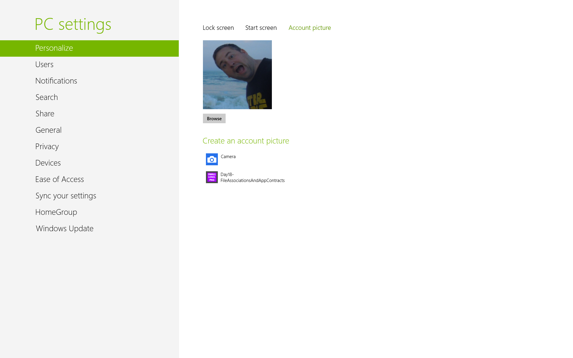 You can declare this functionality if you can provide the ability for the user to create a new Account Picture in Windows 8. You get to the menu on the Start Screen, like this: