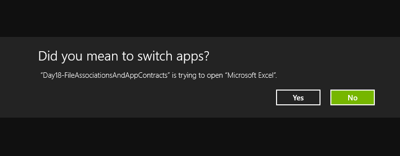 As you can see in this first example, it’s pretty simple. We call Launcher.LaunchFileAsync(), and pass it a StorageFile object. Sometimes, however, you might want to warn your user that you are going to be launching another piece of software, so that they get to decide if that’s really what they want to do. In this case, we can create a LauncherOptions object, and provde that as part of our LaunchFileAsync() call. Like this: