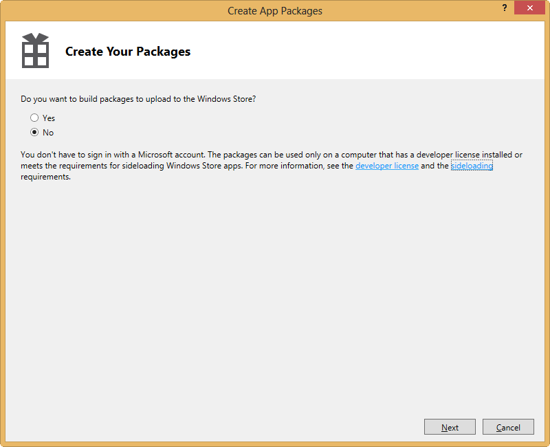 To get started, Project –> Store –> Create App Packages… As you can see, the first dialog box you’re presented with is in fact the two different options we just mentioned.
