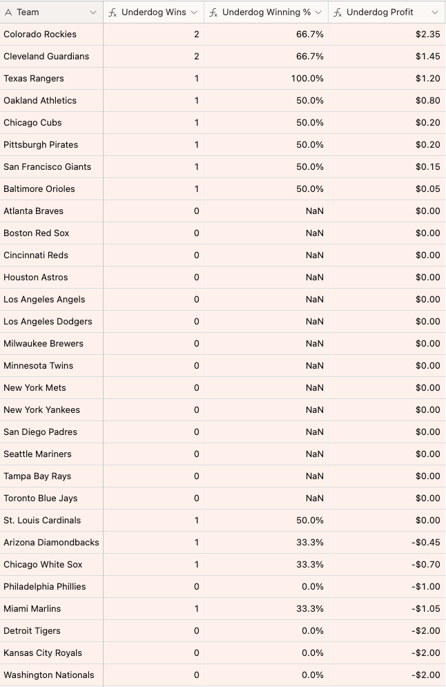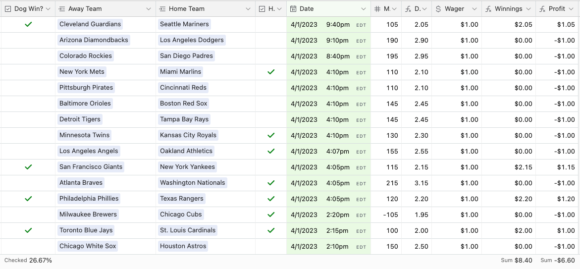 April 1st has me feeling like an April Fool. Our first losing day. What’s interesting is that there were several games with outcomes that changed in the last inning, so it felt like I was going to have a better day than this. I definitely don’t expect to win every day, so this is an acceptable outcome.