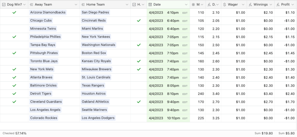 The paragraph above was what I wrote when I thought I was up $34.75 in 5 days. It turns out I was counting the $1 wager I made in each winning game, which at this point is 34 wins. I’m actually humbled but thankful that I’m up only $0.75!