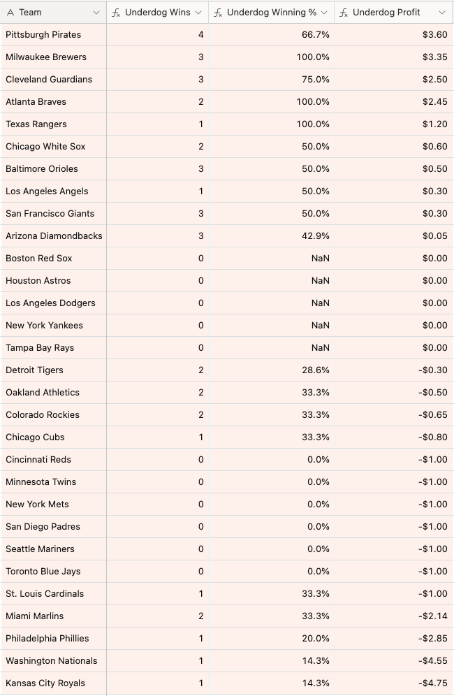 This is starting to get out of hand. Another crushing day for the underdogs, who only won one game. Thankfully, due to inclement weather, there were only six games played.