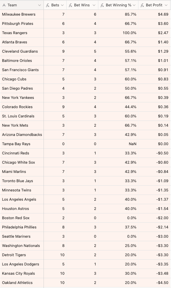 The good news, I suppose, is that my other bets are keeping this endeavor afloat. I bet $5 that the Yankees and Guardians would combine for more than 1 run scored in the first inning last night. After the Yankees put up a ZERO, I was worried, but the Guardians came through, putting up 2 in the bottom of the inning.