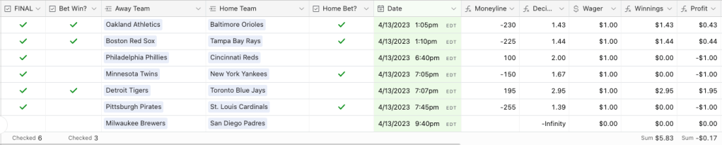 It should be noted that at the time I made my wagers, the Brewers/Padres game wasn’t available for betting, so I missed that one completely.